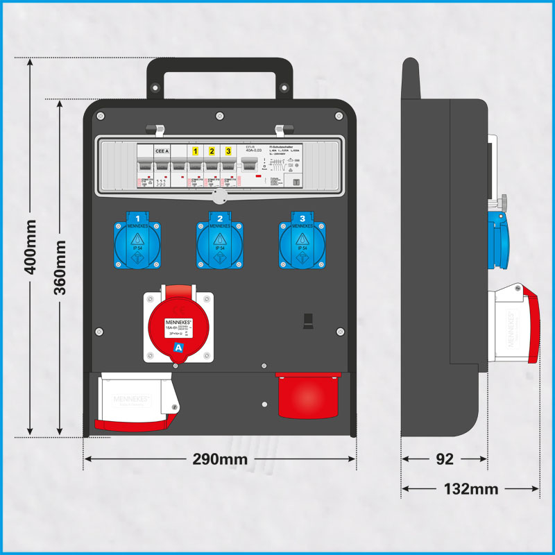 1x CEE 32A/400V durchverdrahtet (nicht über FI), 1x CEE 16A/400V, 3x Schukodose mit Klappdeckel